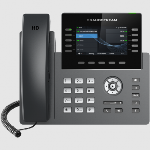 GRP2615 je snažan 10-linijski carrier grade IP telefon elegantnog dizajna sa nizom značajki nove generacije, uključujući integrirani WiFi, Bluetooth podršku, 40 višenamjenskih tipki, podršku za dodatni BLF modul, dvostruke gigabitne portove i mnogo više. Ovaj uređaj sadrži veliki 4.3“ LCD ekran u boji sa zamjenjivom prednjom maskom za jednostavnu prilagodbu loga. GRP serija IP telefona podržava napredne sigurnosne karakteristike, poput sigurnog podizanja, dvojnog firmware imagea i enkriptirane pohrane podataka. Za postavljanje u cloudu i centralno upravljanje, GRP2615 je podržan od strane Grandstream Device Management Systema (GDMS), koji pruža centralno sučelje za konfiguraciju, postavljanje, upravljanje i praćenje Grandstream endpointa.