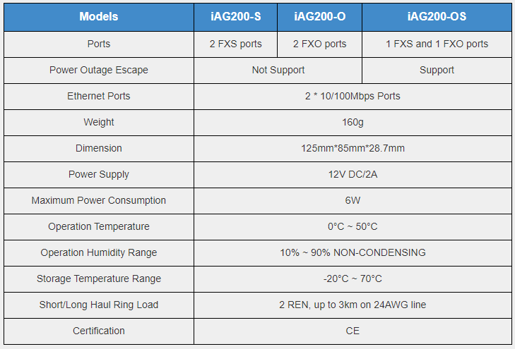 It can be configured for different country uses, provides a wide selection of codecs including G.711A、G.711U、G.729、G.722、G.726、iLBC. The iAG Analog VoIP Gateways use standard SIP protocol and fully compatible with leading IMS/NGN platform, IPPBX and SIP servers.