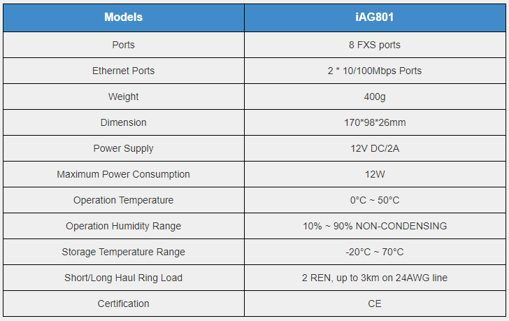 OpenVox iAG801 Series Analog VoIP Gateway supports 8 FXS ports. With features of small size, exquisite enclosure and high performance, the iAG Analog VoIP Gateway is specially designed for saving space and maximizing cost savings, it is ideal for SMBs and SOHOs.
