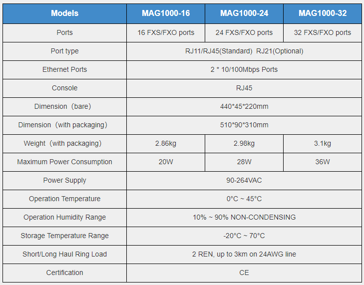 OpenVox MAG1000 Series Analog VoIP Gateway supports 16/24/32 ports of FXO/FXS port combination. With the features of exquisite enclosure and high performance, MAG series analog gateways are specially designed to save space and maximize cost savings.It is an excellent solution for the industry VoIP analog gateway.